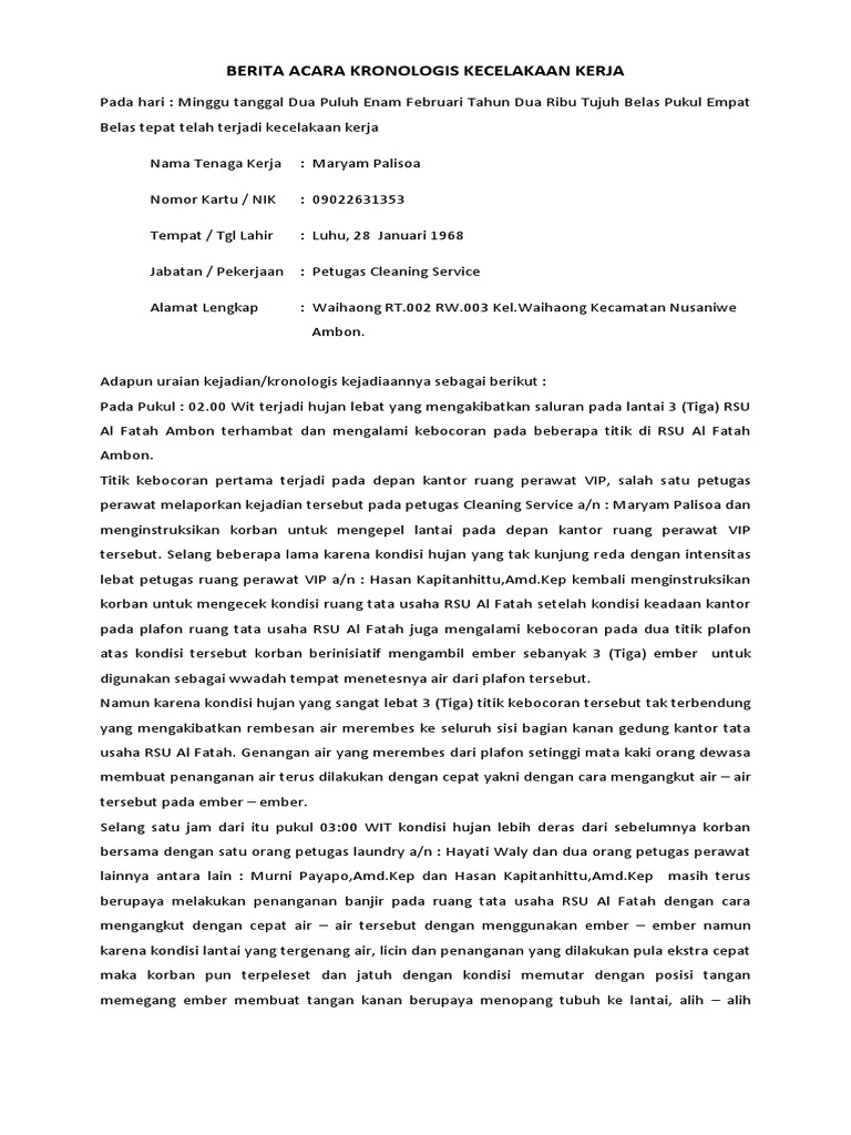 Pada hari kamis tanggal 10 oktober 2019 telah terjadi kecelakan kerja dengan keterangan sebagai berikut : Contoh berita acara kronologis kecelakaan untuk klaim bpjs. Menerangkan dengan sebenarnya bahwa telah terjadi kecelakaan yang menimpa karyawan atas nama : Berita acara kejadian adalah susunan acara suatu kejadian tertentu sebagai bukti legal tentang berlangsungnya suatu kejadian membuat berita acara kejadian sebagai berikut : Keluarga menganggap kejadian ini adalah musibah.