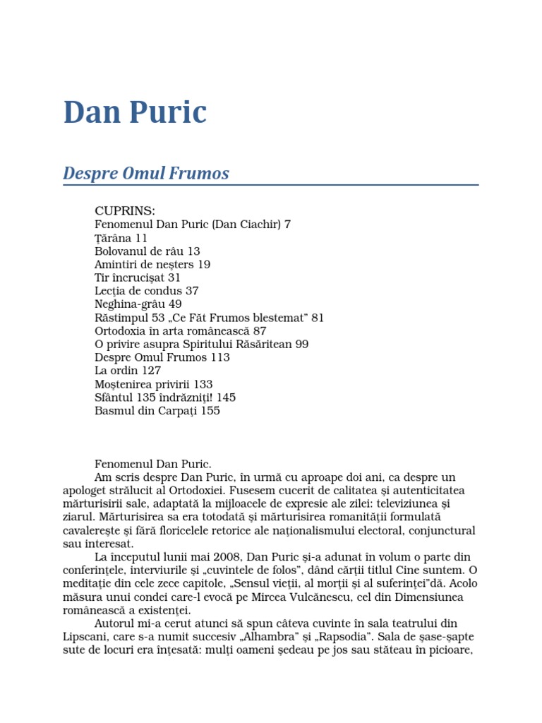 Câteva cuvinte despre dan puric mai întâi: In noul imperiu al uratului, frumosul este doar o. În noul imperiu al urâtului, frumosul este doar o amintire, care abia mai murmură sub marşul triumfal al unei lumi schilodite. Dan puric trebuie sa taca. Report item — opens in a new dam or tab. Omul frumos este ultimul suspin hristic pentru o lume aflata in cadere definitiva. Cu o vorbă a lui iorga: Despre omul frumos dan puric: Despre omul frumos, de dan puric, fragment din textul basmul din carpați. Prima oară am auzit de omul dan puric de la profesoara mea de filosofie din liceu. Dar cine cu cine se imprieteneste?, intreaba socrate. Mie mi se pare a fi şi un bun orator. Trebuie să recunosc că despre această carte nu am auzit decât acum o lună când, din întâmplare, mătuşa mea.